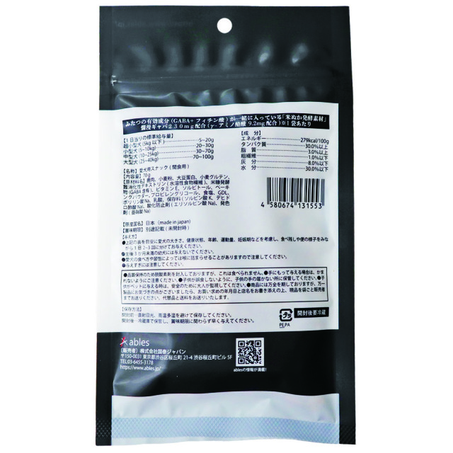 | 原材料 | 鹿肉、小麦粉、大豆蛋白、小麦グルテン、難消化性デキストリン(水溶性食物繊維)、米糠発酵物(GABA含有)、ビタミンE、ソルビトール、ベーキングパウダー、プロピレングリコール、食塩、GDL、ポリリン酸Na、乳酸、保存料(ソルビン酸K、デヒドロ酢酸Na)、酸化防止剤(エリソルビン酸Na)、発色剤(亜硝酸Na) |