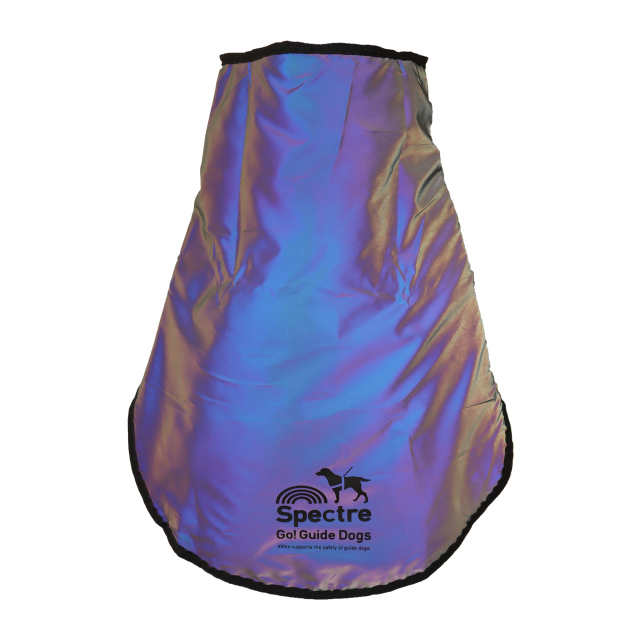 特許技術の暗闇で光にあたるとオーロラに反射する特殊なリフレクター素材「LIGHT FORCE(ライトフォース)」を使用したお散歩用のマントです。日中は黒色、暗闇で光が当たるとオーロラ色に反射します。